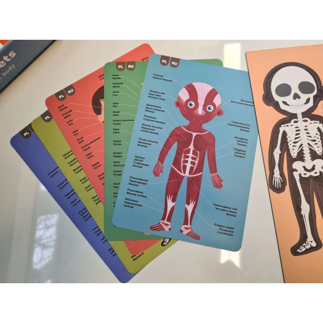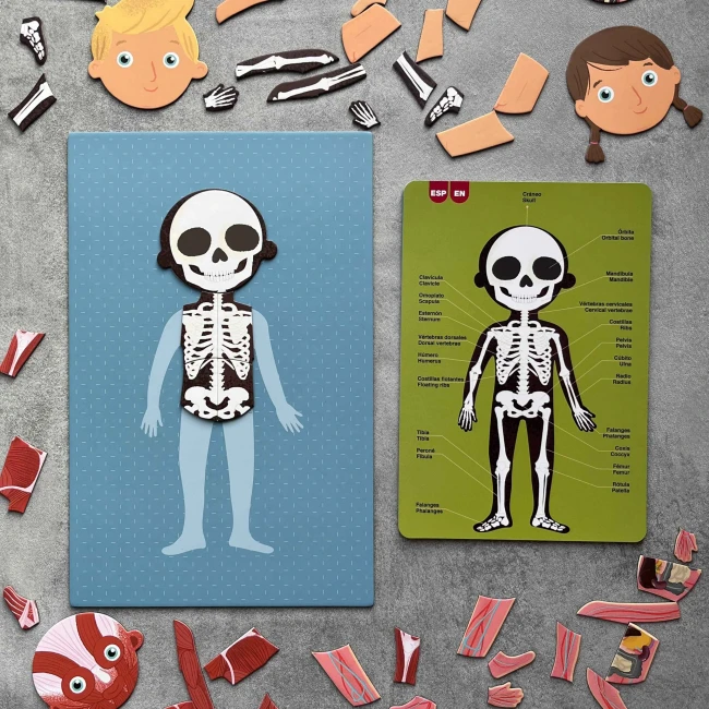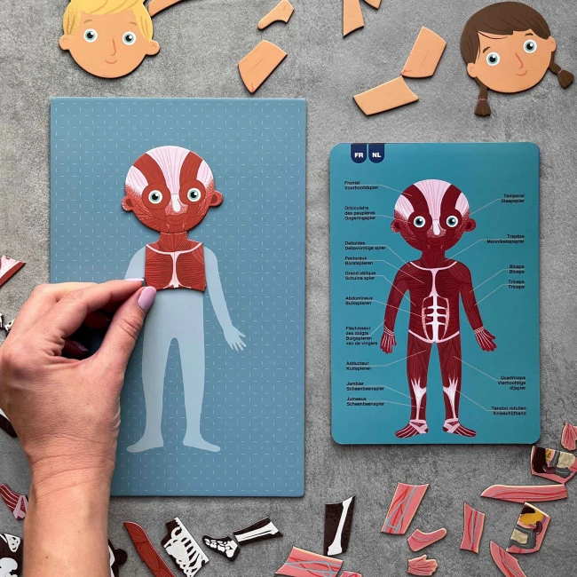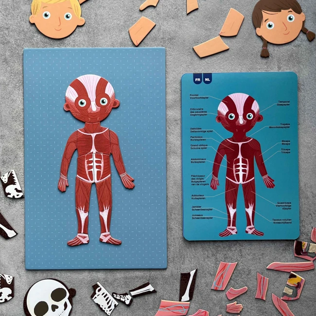 Zestaw składa się z planszy oraz 63 magnetycznych elementów, przedstawiających szkielet, narządy oraz mięśnie. Dodatkowo, w zestawie znajduje się 15 kart informacyjnych w 12 językach.