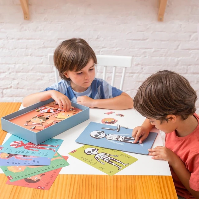 Zestaw „Ciało człowieka” od Apli Kids to idealna edukacyjna zabawka dla dzieci, która umożliwi poznanie i zapamiętanie budowy ludzkiego ciała. Zestaw składa się z planszy oraz 63 magnetycznych elementów, przedstawiających szkielet, narządy oraz mięśnie. Dodatkowo, w zestawie znajduje się 15 kart informacyjnych w 12 językach, w tym w języku polskim, zawierających szczegółowe opisy poszczególnych części ciała.
