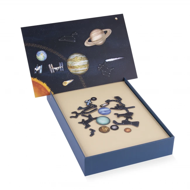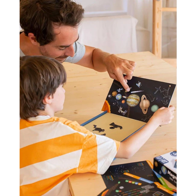 Zestaw zawiera 27 magnetycznych elementów z kosmiczną grafiką oraz 7 kart z ciekawostkami w 10 językach, w tym po polsku