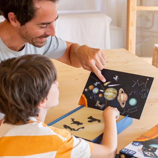 Magnetyczna układanka Apli Kids z wersją Układu Słonecznego to nie tylko zabawka, ale również świetny sposób na naukę poprzez zabawę. Dzieci, układając magnesy, odkryją tajemnice planetarnego systemu, konstelacji gwiazd oraz faz księżyca, rozwijając przy tym logiczne myślenie, wyobraźnię oraz małą motorykę. Zestaw zawiera 27 magnetycznych elementów z kosmiczną grafiką oraz 7 kart z ciekawostkami w 10 językach, w tym po polsku, co dodatkowo wzbogaca edukacyjny charakter zabawy. Planszę do układania magnesów można schować w podstawie pudełka, dzięki czemu układanka idealnie sprawdzi się w podróży.